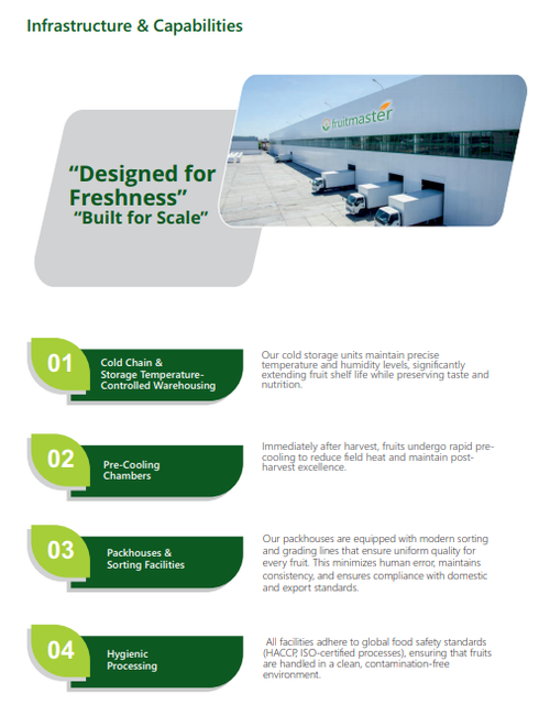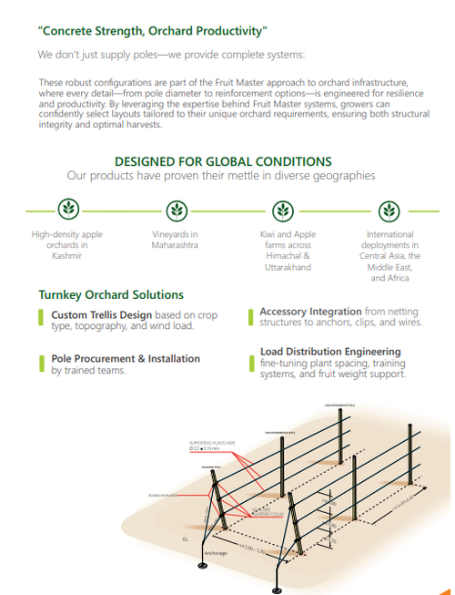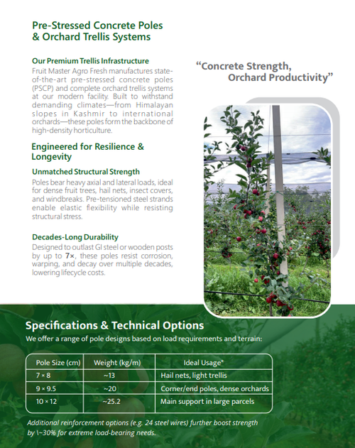 Fruit Master Agro Fresh Pvt. Ltd. is a leading agricultural supply chain company and the largest manufacturer of PSC concrete poles in India. We are also among the biggest exporters of concrete poles from India to various international markets. In addition to pole manufacturing, we provide complete covered trellis solutions along with related equipment to farmers and professional installation companies. You may also visit our website, www.fruitmaster.in, for further insight into our capabilities and product portfolio.